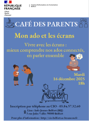 Le CIO de Belfort organise le mardi 16 décembre 2025 à 18h, dans les locaux du BIJ de Belfort, 3 rue Jules Vallès, un café des parents sur les ados et les écrans. Ce temps d’échange vous permettra de mieux comprendre les usages des écrans, des jeux vidéo et de l’IA chez les adolescents. Vous …